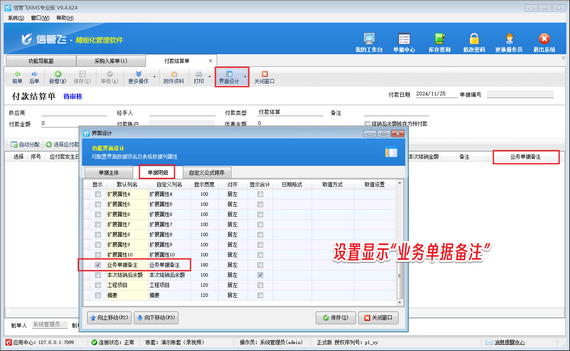 在功能導(dǎo)航窗點(diǎn)擊“往來(lái)管理”—》“付款結(jié)算單”打開付款結(jié)算單列表界面,新增付款結(jié)算單,打開付款結(jié)算單界面。然后在付款結(jié)算單界面工具欄點(diǎn)擊“界面設(shè)計(jì)”,在單據(jù)明細(xì)內(nèi),找到“業(yè)務(wù)單據(jù)備注”并勾選顯示出來(lái)。
