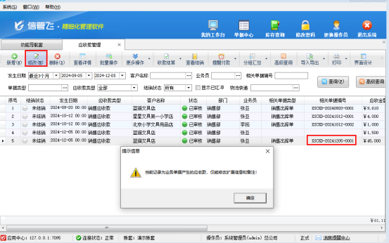 單據審核后自動生成的應收款,在往來管理應收款管理中點擊“修改”會提示“當前記錄為業務單據產生的應收款,僅能修改擴展信息和備注!”,不能直接修改,如下圖所示: