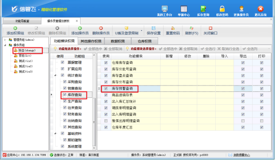 首先使用系統管理員賬號登錄軟件,在功能導航窗點擊“系統管理”—》“操作員及授權”打開操作員管理及授權界面,選擇操作員“張亞”,在其右側的功能模塊權限內選擇“庫存查詢”,將庫存預警查詢勾選,然后保存權限設置,如下圖所示: