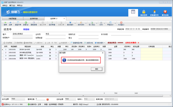 權限設置完成后,更換操作員賬號“張亞”重新登錄軟件,打開一個已開的送貨單,重新發送微信模板消息,即可發送成功,如下圖所示。