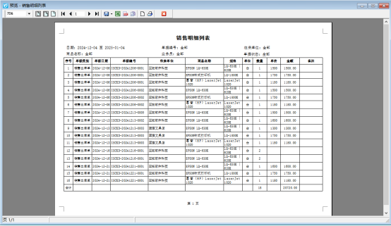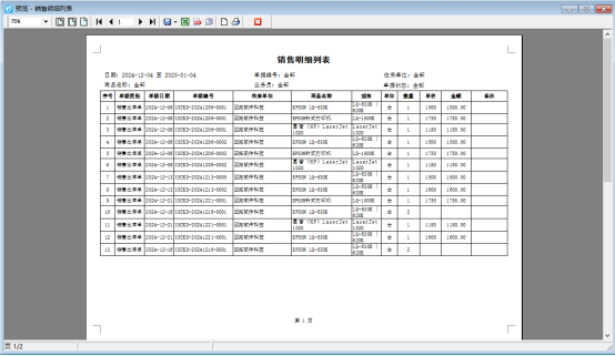 以銷售單明細查詢界面為例,按照往來單位設置分組顯示打印銷售明細,未設置時打印預覽如下顯示: