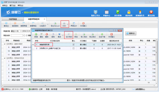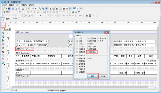 在銷售單明細查詢界面點擊打印---打印格式設計,選中模板點擊設計格式;進入模板設計器,在模板設計器界面點擊“插入邊條”,選擇分組標頭,分組標頭高度設置為0,如下