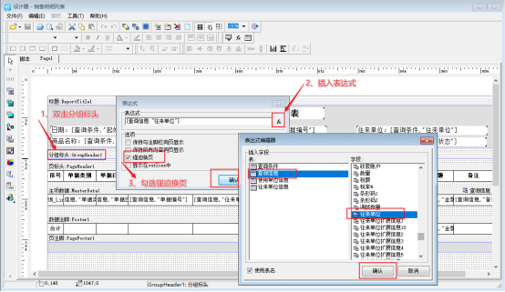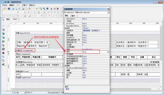 雙擊分組標頭,插入表達式“[查詢信息."往來單位"]”,勾選強迫換頁;選擇分組標頭右鍵點擊屬性,換頁設置值為“True”。