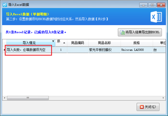 銷售單開單界面,直接導(dǎo)入EXCEL明細(xì)出現(xiàn)提示“導(dǎo)入失敗,必填數(shù)據(jù)項(xiàng)為空”,這是因?yàn)檐浖锩婺承⿺?shù)據(jù)項(xiàng)設(shè)置了必填,表格里面卻沒(méi)有數(shù)據(jù)導(dǎo)致的,如圖:
