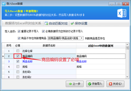 解決方法如下:開單界面點(diǎn)擊“導(dǎo)入導(dǎo)出”-》“從EXCEL導(dǎo)入明細(xì)”重新進(jìn)行導(dǎo)入操作,之后查看軟件設(shè)置的必填項(xiàng),與表格數(shù)據(jù)項(xiàng)進(jìn)行對(duì)照,如圖所示,軟件內(nèi)商品編碼設(shè)置了必須填寫,表格中商品編碼處卻顯示為空,沒(méi)有數(shù)據(jù),在軟件中選中商品編碼數(shù)據(jù)項(xiàng),鼠標(biāo)右鍵取消必填標(biāo)志,取消后點(diǎn)開始導(dǎo)入,明細(xì)即可導(dǎo)入成功。