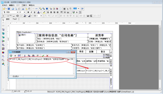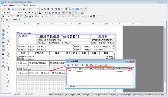 小寫數據顯示:¥[IIF([_RM_Page]=[_RM_TotalPages],[單據主體."應收應付金額"],Sum([單據明細."金額"],DetailData1,,))]