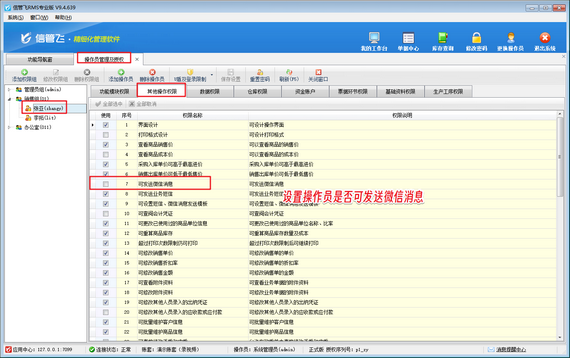 那么,如何根據(jù)企業(yè)實(shí)際需求,靈活設(shè)置操作員的微信消息發(fā)送權(quán)限呢?在信管飛RMS系統(tǒng)中,只需簡(jiǎn)單幾步即可輕松實(shí)現(xiàn)。通過(guò)“系統(tǒng)管理”下的“操作員及授權(quán)”功能,進(jìn)入操作員權(quán)限配置界面,即可對(duì)特定操作員的“可發(fā)送微信消息”權(quán)限進(jìn)行開(kāi)啟或關(guān)閉。