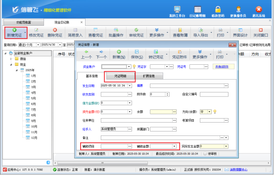 信管飛出納記賬軟件為用戶提供了高度自定義的新增憑證設置功能,操作流程簡便易懂。您只需打開“系統管理”,點擊進入“系統參數配置”界面,在眾多參數選項中精準定位到出納參數板塊。在這里,您可以根據企業實際業務需求,自由勾選是否在新增憑證時顯示“輔助項目”和“憑證明細”等關鍵項目。完成勾選并保存設置后,當您進入“出納管理”模塊的日記賬頁面,新增日記賬時,相應界面便會清晰呈現“輔助項目”“憑證明細”等填寫區域,所有重要信息盡收眼底,一目了然。