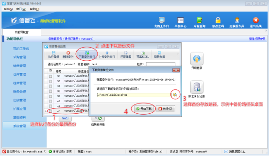 執行備份文件后,點擊“下載備份文件”,選擇備份文件路徑,示例中保存備份文件在桌面,支持自己選擇備份路徑,點擊開始下載(下載進度條到達100%提示備份完成桌面生成dbz備份文件)。