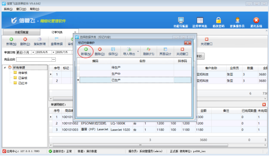 信管飛軟件支持對(duì)訂單列表、送貨單列表以及退貨單列表使用不同顏色旗幟標(biāo)記備注,把標(biāo)記常用內(nèi)容可提前維護(hù)到數(shù)據(jù)字典中,方便標(biāo)記時(shí)候直接選擇錄入,例如訂單列表,可以先把生產(chǎn)狀態(tài)維護(hù)在數(shù)據(jù)字典中,標(biāo)記直接使用。本文示范下如何操作?