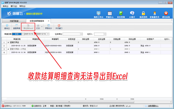 收款結(jié)算單用來(lái)登記收款信息(收款對(duì)象即客戶(hù)、收款賬戶(hù)、收款金額、經(jīng)手人等),并結(jié)銷(xiāo)應(yīng)收款記錄。另外系統(tǒng)也支持收款結(jié)算明細(xì)查詢(xún)匯總表,有用戶(hù)操作員賬號(hào)登錄軟件無(wú)法導(dǎo)出收款結(jié)算明細(xì)查詢(xún)匯總數(shù)據(jù),如下圖所示。