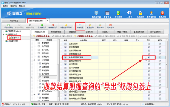 解決方法如下:在功能導(dǎo)航窗點(diǎn)擊“系統(tǒng)管理”—》“操作員及授權(quán)”打開(kāi)操作員管理及授權(quán)界面,選擇操作員賬號(hào)“李拓”,然后在其右側(cè)的功能模塊權(quán)限內(nèi)選擇“往來(lái)查詢(xún)”,將收款結(jié)算明細(xì)查詢(xún)的“導(dǎo)出”權(quán)限勾選上,然后保存權(quán)限設(shè)置,如下圖所示。