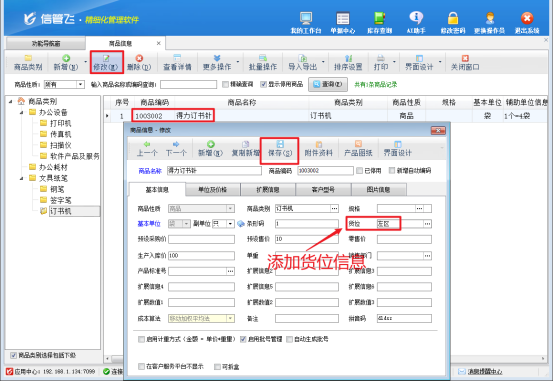 在“商品信息”界面中,您會看到一系列商品列表。找到您想要設置貨位的商品,選中該商品后,點擊界面上的“修改”按鈕。此時,系統會彈出商品信息修改窗口,在這個窗口中,您可以找到專門用于錄入貨位信息的字段。將商品實際存儲的貨位準確錄入后,點擊“保存”按鈕,該商品的貨位信息就設置成功了。