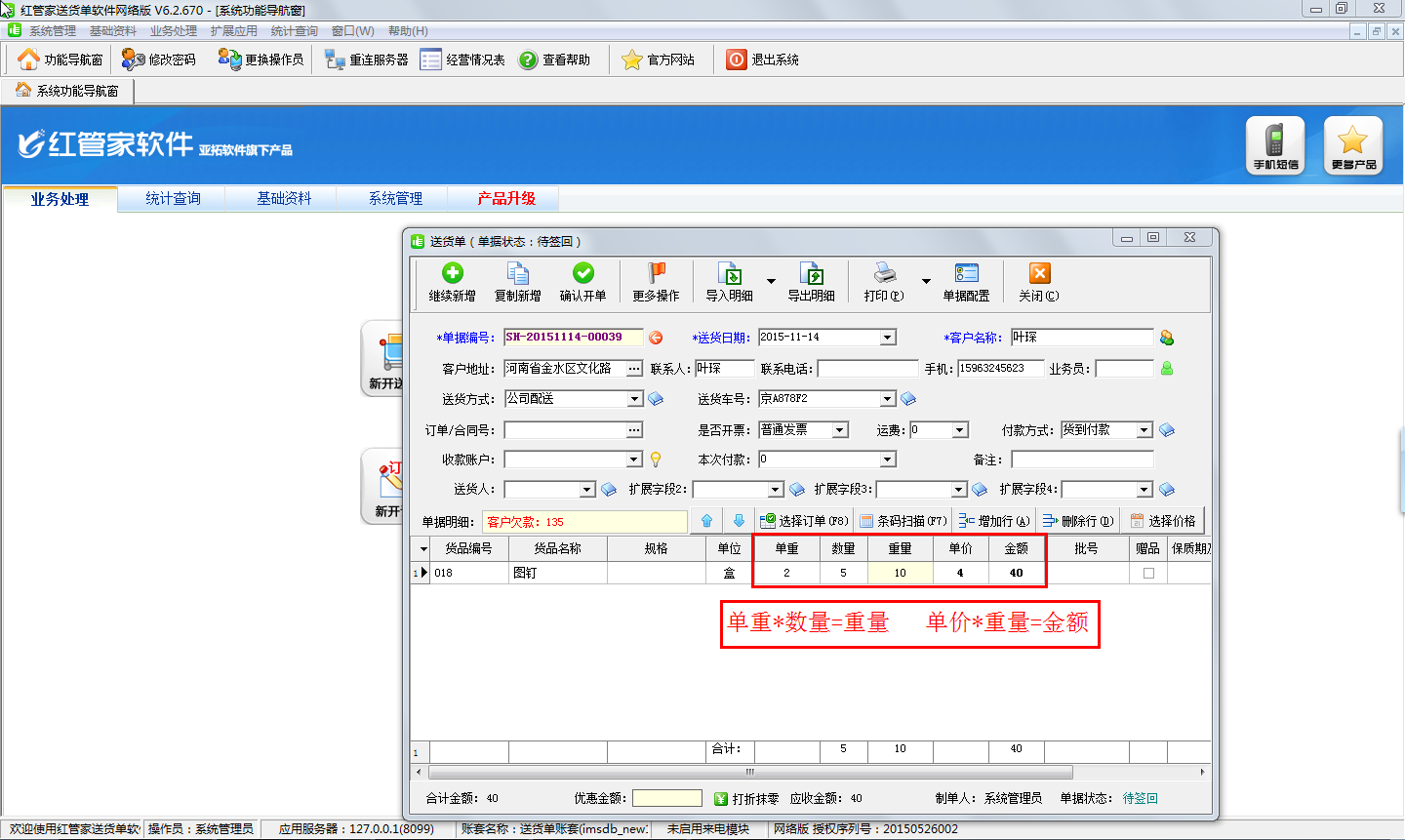 亞拓軟件開發(fā)的紅管家送貨單軟件中支持按重量計算金額,由于多數(shù)用戶是按數(shù)量來計算金額的,因此在送貨單打印軟件中開單時,明細中的金額默認取單價乘以數(shù)量的值(即 金額 = 單價 * 數(shù)量),那么部分用戶的產品如果需要按重量計算金額(比如農副產品)在送貨單管理軟件中又該如何進行設置呢?下面我們就詳細介紹下紅管家送貨單軟件中如何設置按重量來計算金額? &nbs