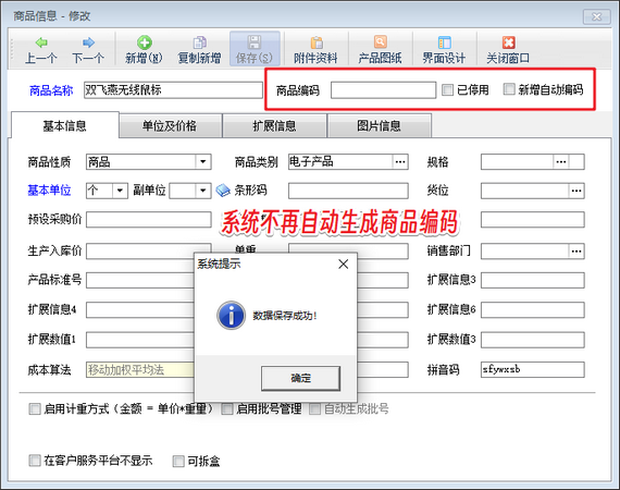 在實際使用信管飛RMS進行商品管理的過程中,有些用戶更新到新版本后發現新增商品時系統會自動生成商品編碼,如下圖所示。而這一功能對于某些用戶來說并不必要,甚至可能會導致商品編碼混亂。 針對這一問題,本文介紹一下如何在信管飛RMS中取消新增商品時的自動生成商品編碼功能,通過調整系統編碼規則設置來優化商品管理流程,使其更加符合用戶