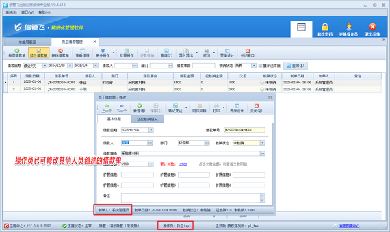 信管飛出納記賬軟件的員工借款管理及還款管理可以對企業員工借款、還款進行流程化登記管理,提高了企業管理效率。 演示視頻觀看鏈接:操作員無法修改其他人員創建的員工借款單,如何解決演示視頻 有用戶操作員賬號登錄軟件修改員工借款單時,提示“當前數據由其他人員創建,您沒有權限修改!”,如下圖所示。&