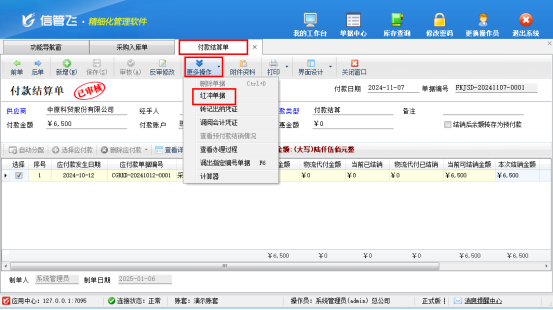 信管飛RMS軟件是集進銷存和應收應付款管理一體的軟件,有客戶咨詢需要反審修改單據的單價時修改不了,如何解決,提示如下圖所示: 已結銷應付款的單據需要反審修改,需變為“未結銷”狀態,快捷操作方式,在采購入庫單界面點擊更多操作下的“查看應付款及結銷情況”,彈出界面點擊“查看結算單”如下圖所示: