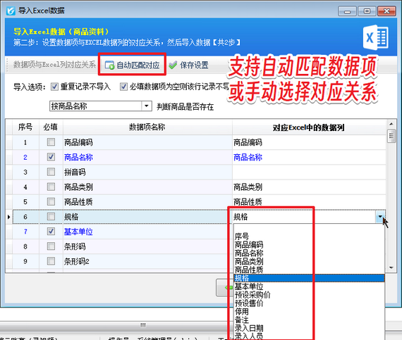 信管飛軟件支持通過Excel導入數據,通過Excel數據導入可以將數據方便快捷的導入到軟件中,省去了使用初期大量的數據的錄入所要消耗的時間及人力物力,并避免人為錄入的誤差,使數據錄入的簡單、準確、高效。對于有獨立雙單位的商品,系統支持錄入副單位,部分客戶在導入商品信息后,會發現副單位沒導入成功,這通常是由于數據項沒成功對應導致的。 &nb