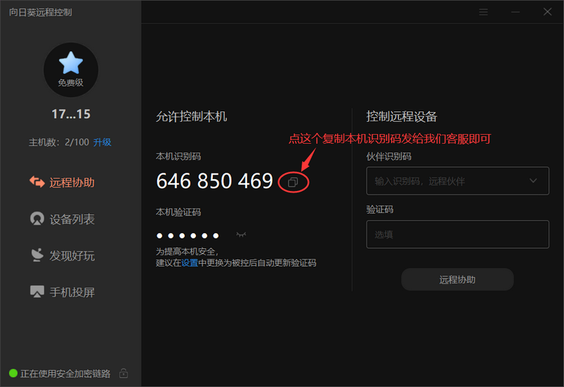 向日葵遠(yuǎn)程控制需要提供識別碼(每臺電腦的唯一碼),直接把識別碼復(fù)制或截圖發(fā)給我們客服即可。我們邀請遠(yuǎn)程后需要你在電腦右下角點(diǎn)“確認(rèn)”才可以連接。如下圖所示: