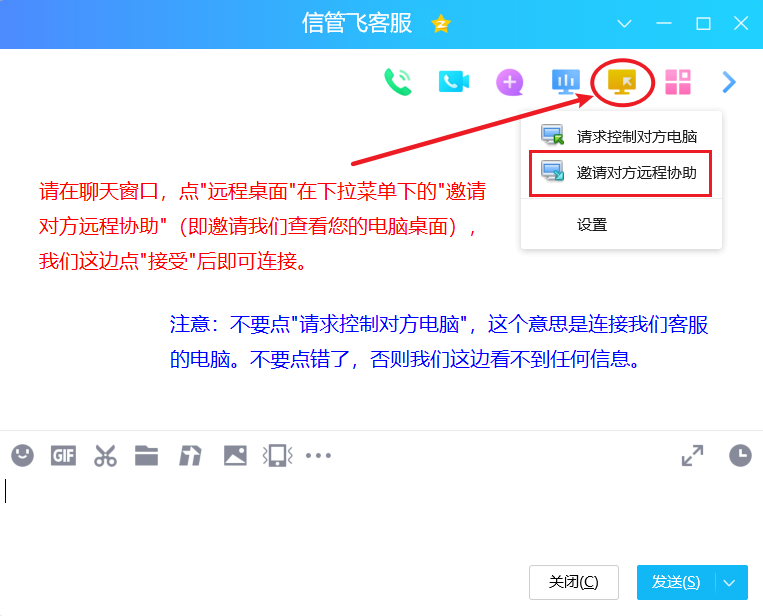 打開QQ并添加我們的客服QQ號為好友(添加任一客服QQ即可,請勿重復(fù)添加),然后在QQ聊天窗口,點(diǎn)擊“遠(yuǎn)程桌面”-》“邀請對方協(xié)助”如下圖所示(我們以QQ9.4.5版本為例,之前版本的操作方法基本一樣):