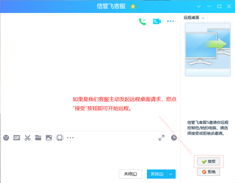 部分情況下,我們客服也會主動(dòng)發(fā)起遠(yuǎn)程桌面請求,請?jiān)赒Q聊天窗口,點(diǎn)“接收”按鈕同意遠(yuǎn)程桌面,我們就可以看到您電腦桌面,如下圖所示: