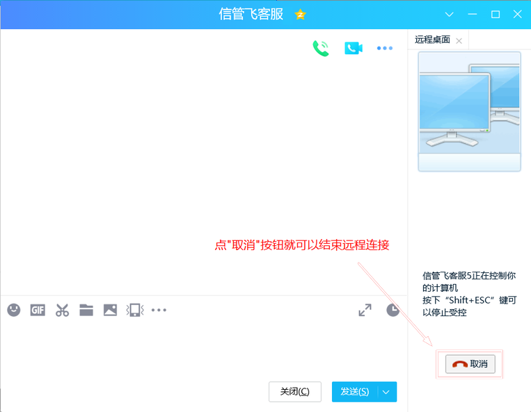問題處理完后,您可以點(diǎn)“取消”按鈕,就可以結(jié)束遠(yuǎn)程協(xié)助。如下圖所示: